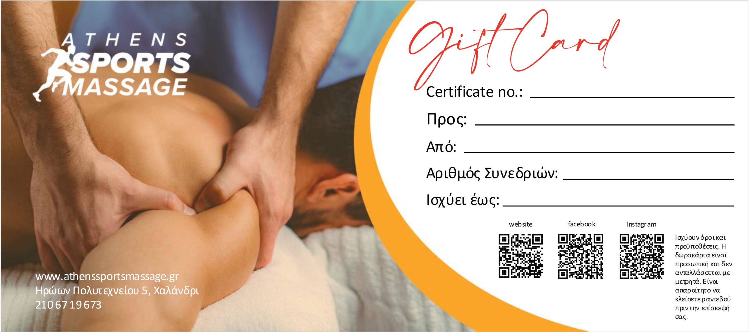 Αν θέλεις να κάνεις στους αγαπημένους σου ένα δώρο ή μία έκπληξη που σίγουρα θα τους αρέσει, χάρισέ τους μία Gift Card από το Athens Sports Massage. Με δυνατότητα επιλογής ανάμεσα σε μια πληθώρα υπηρεσιών μασάζ, αποτελεί ένα δώρο εμπειρίας, χαλάρωσης και ευεξίας! Ένα δώρο που ο καθένας θα χαιρόταν να λάβει!